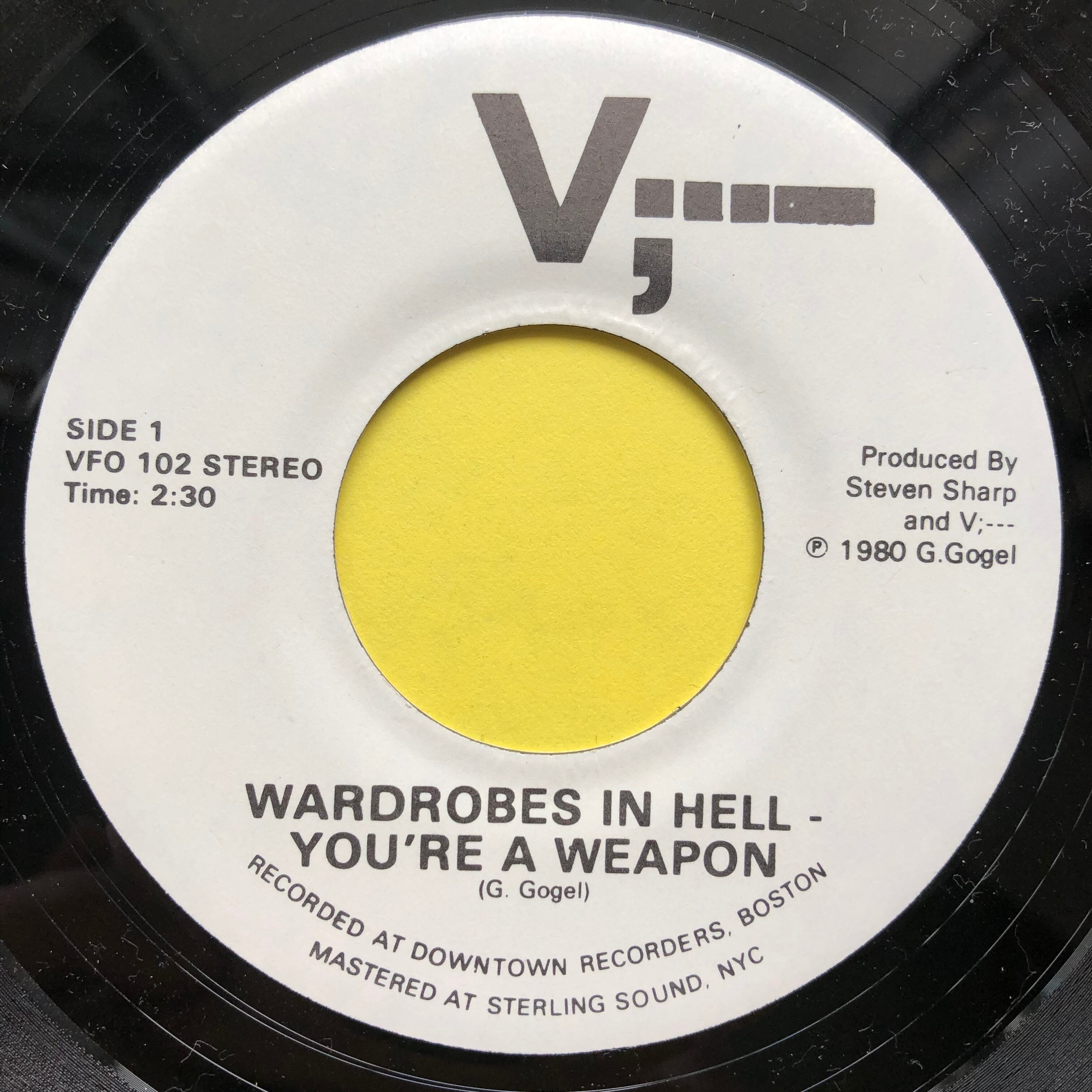 ボストン産  post-punk バンド [ V; ] a.k.a Vee (ヴィー) のファースト・シングル。女性ヴォーカルのニューウェイヴ、パンク、ハードコア好きにはたまらない全3曲。あの Saigon 等が収録されたコンピ Various – Bust! - A Compilation Of Original Early Worldwide Punk Rock に Wardrobes In Hell / You're A Weapon 収録。レコード vg++  ジャケット vg+ (ジップロック袋なし)