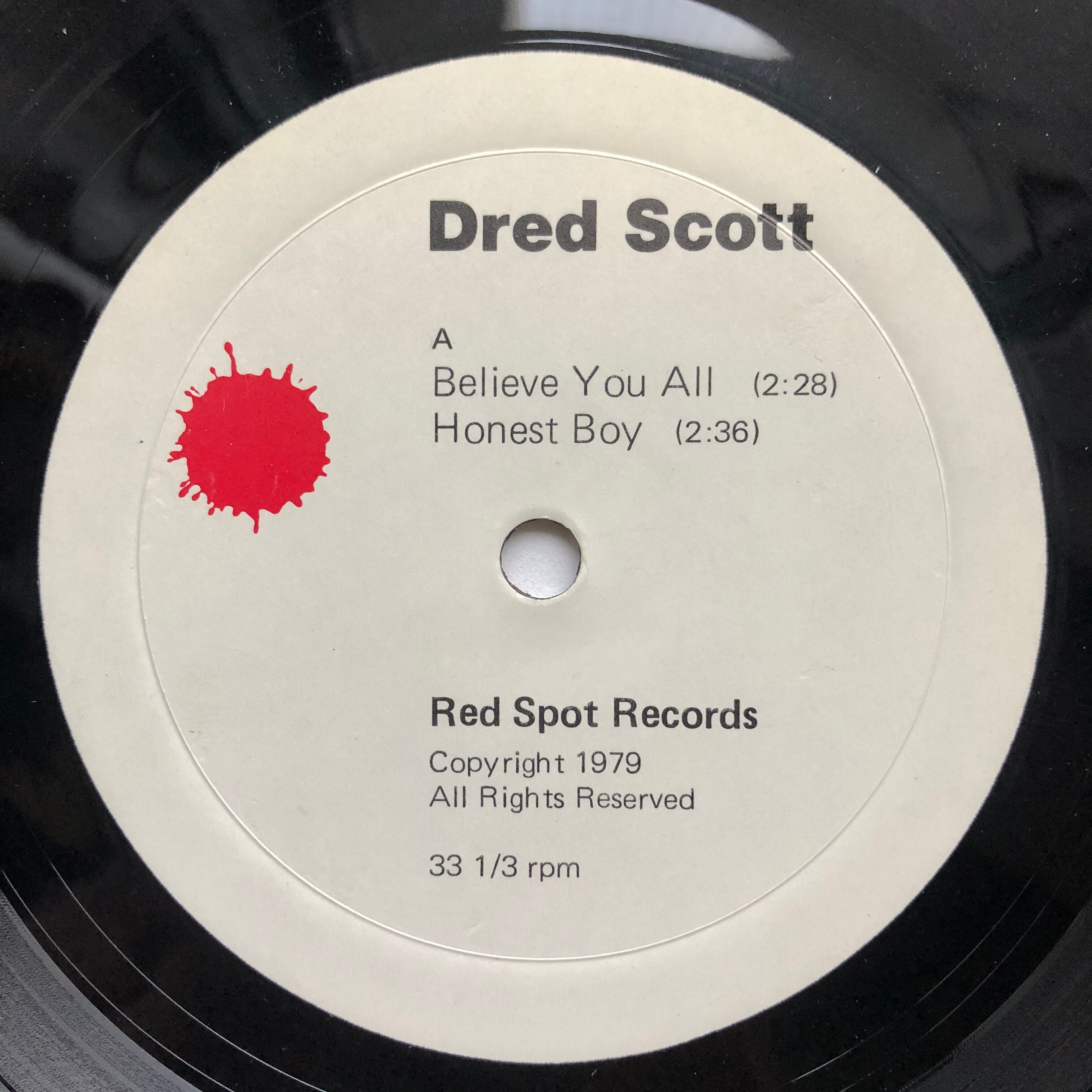 カリフォルニアのアーケーディアの Red Spot Records レーベルより、他リリースはドレッドスコットのもう一枚のシングルとアルバムのみ。必殺 "I Believe You All" は V/A Back Seat Love 2 収録、他3曲も素晴らしき名盤。稀に歌詞インサートが付いているが、こちらは残念ながら無し。レコード:vg+ ジャケット:vg