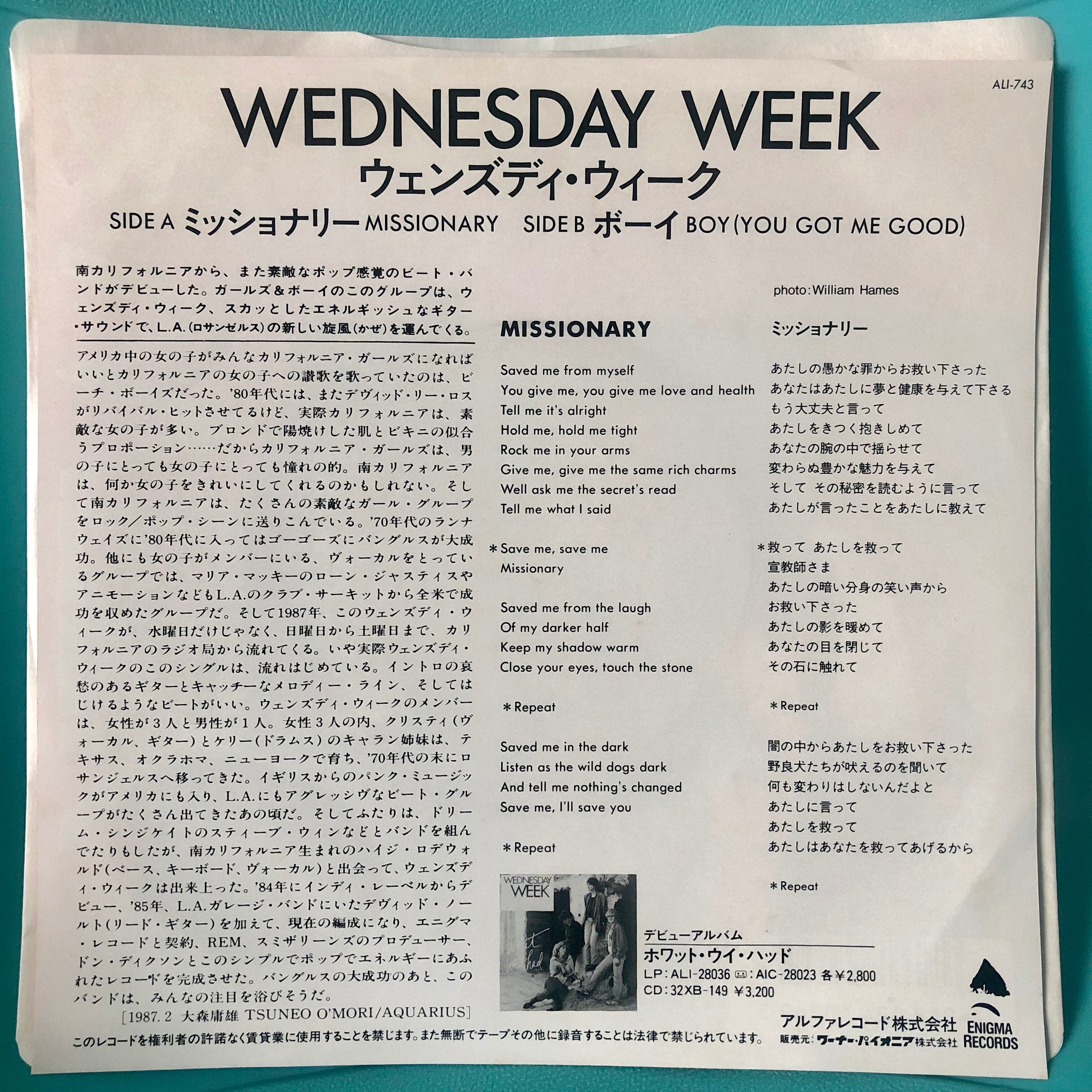 カリフォルニア LA産 Wednesday Week の日本デビューシングル盤。A面 Missionary は1stアルバム収録。B面 Boy (You Got Me Good) は Various - WarfRat Tales に The Last や The Point といっしょに収録されていた曲の嬉しい再録シングル・カット。