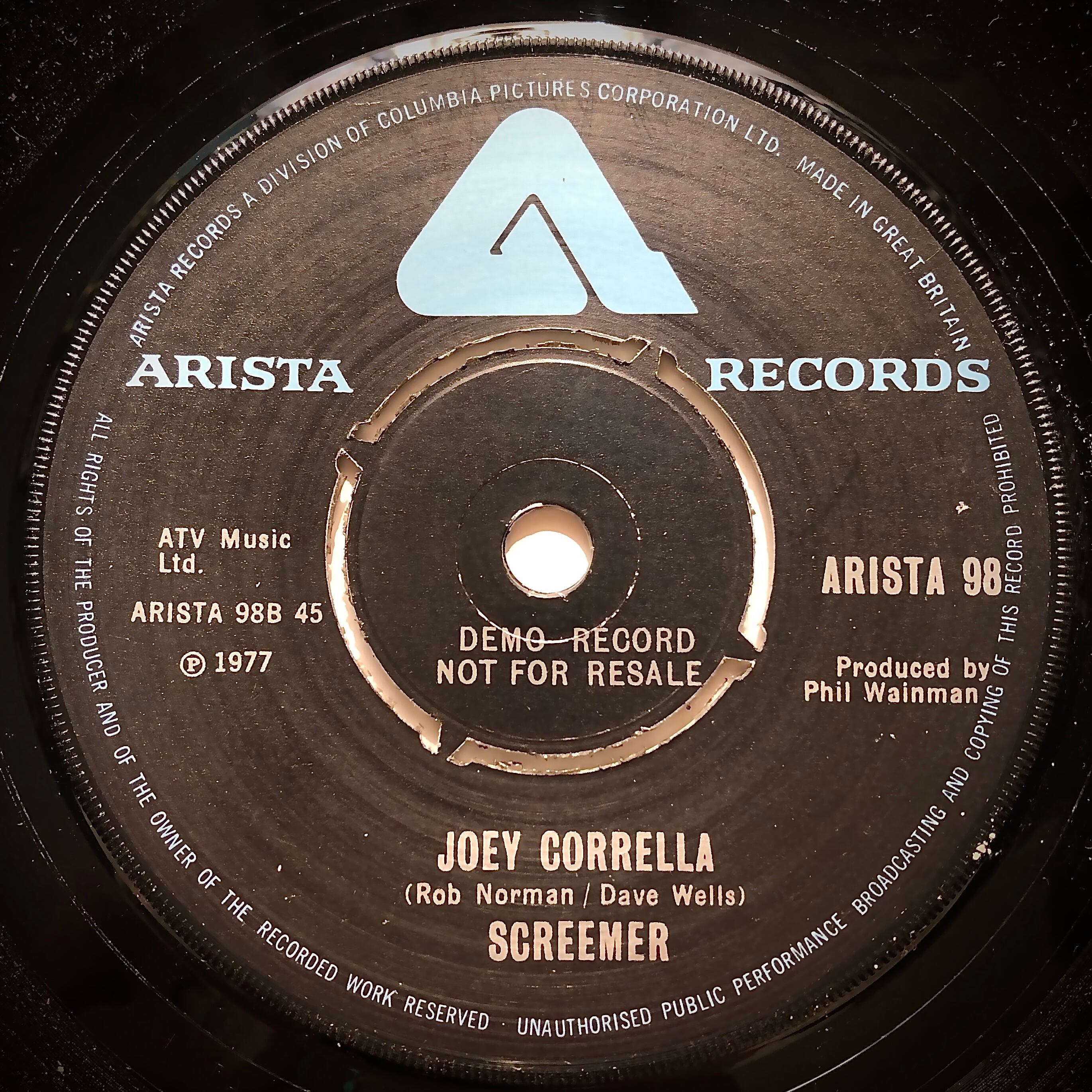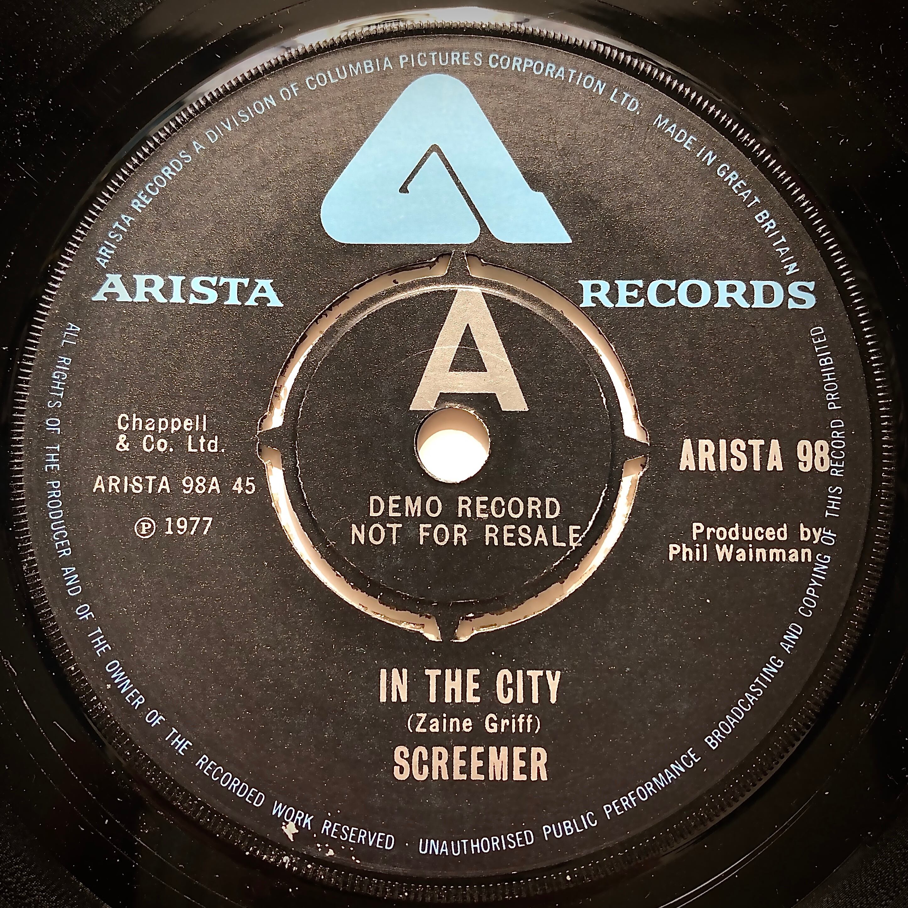 1stシングル Interplanetary Twist が Various – Boobs: The Junkshop Glam Discotheque 収録で知られる英国グラムバンド Screemer の2ndシングルのプロモ盤。後にソロで売れる Zaine Griff 在籍。A面 In The City は David Bowie 影響下のグラム・バラッド名曲。