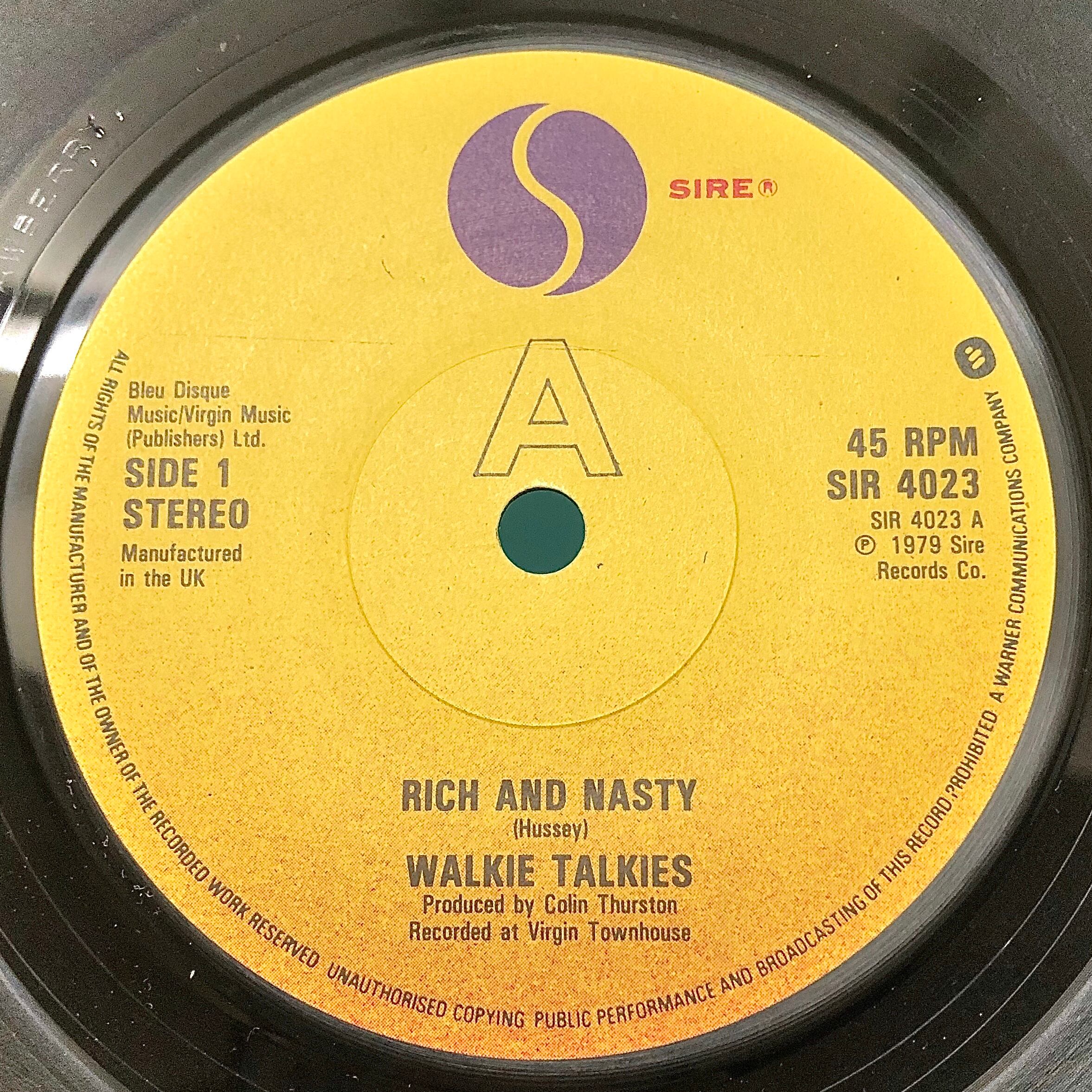 Sireよりリリースされたイギリスの Walkie Talkies 唯一作。The Mission, The Sister Of Mercy, Dead Or Alive の Wayne Hussey 在籍。A面 Rich And Nasty は Various - Sawdust Caesars - Rare UK Mod 1978-1982 収録のSKA調ポップな名曲。B面 Summer In Russia 哀愁パンクでこちらも聴き応えあり。