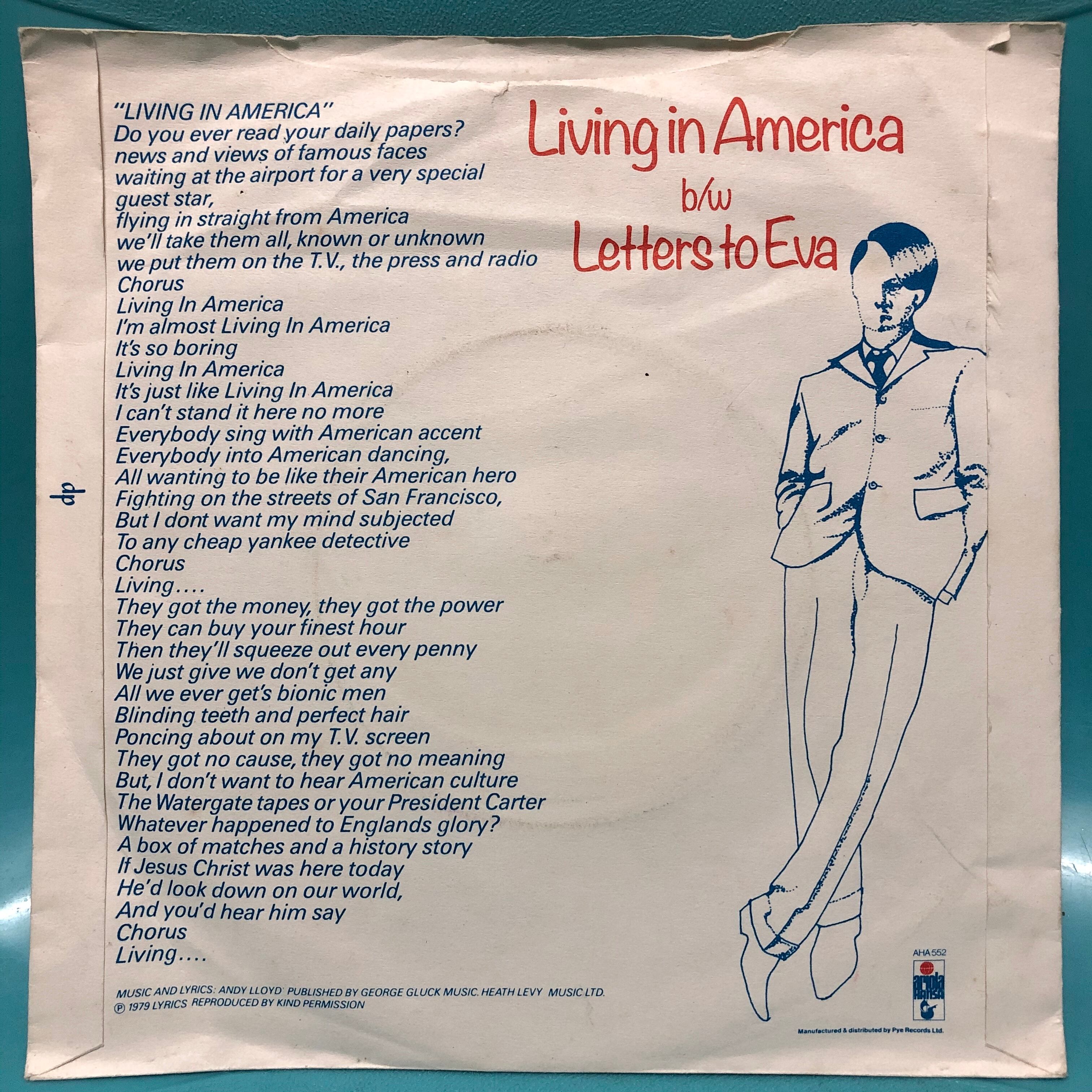 Andy Lloyd 3rdラストシングルUK盤。Back To School みたいのを期待すると肩透かしを食らうが、A面  Living In America は Long Version も存在するローカルヒット曲の様子。B面 Letters To Eva は良質な 80's ポップス。
