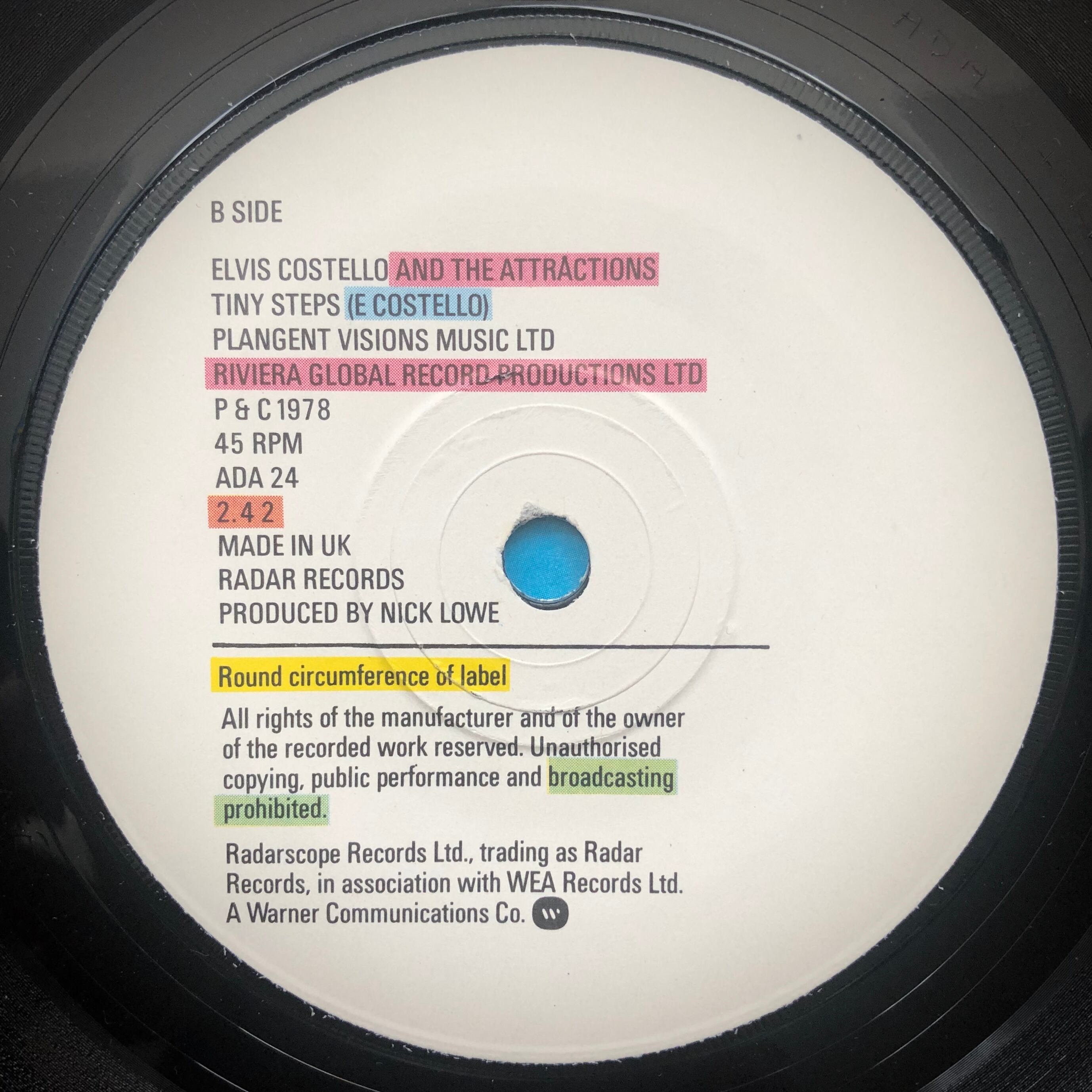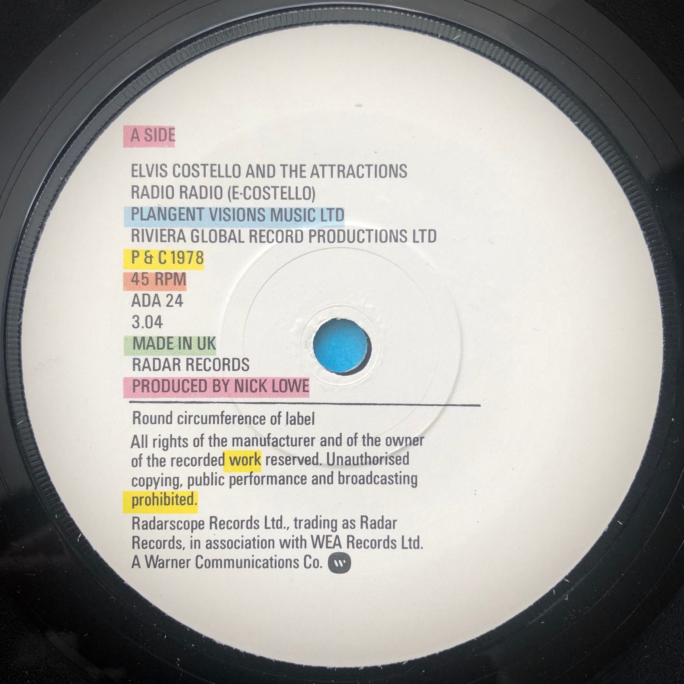 Elvis Costello And The Attractions 名義、Nick Lowe プロデュースの初期シングルUK盤。A面 Radio Radio は言わずもがなクラシック。シングルで待ってたい一枚。