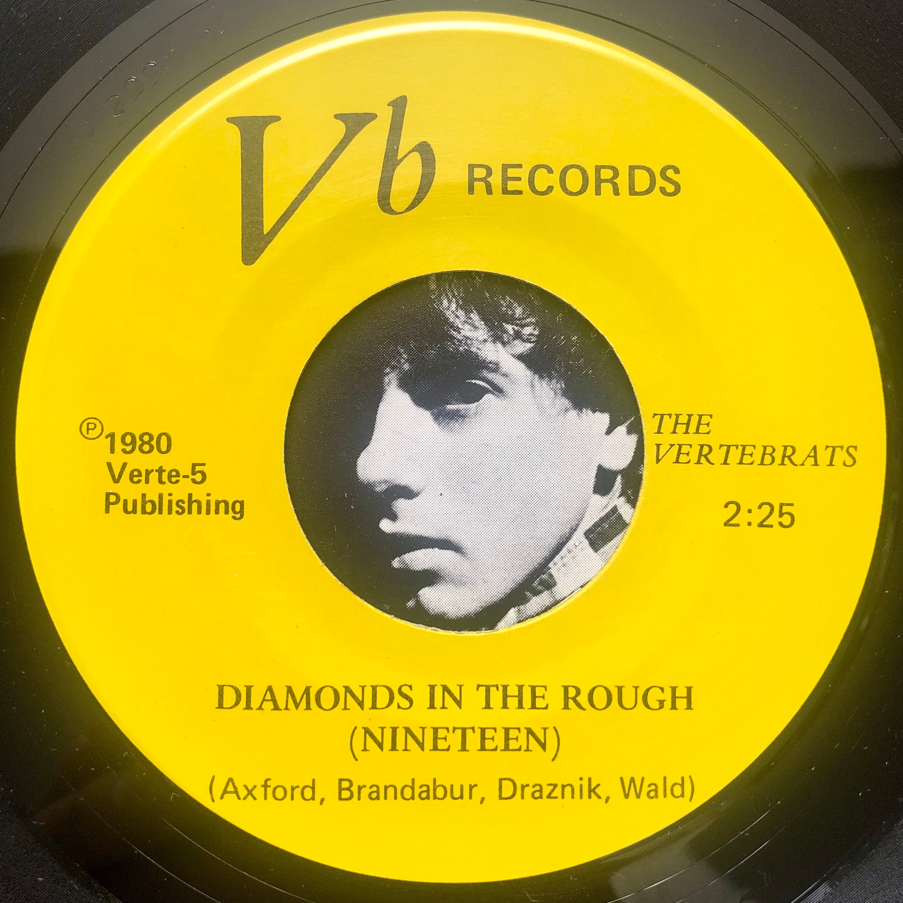 Champaign, Illinois Punk/Powerpop/Garage 最重要バンド The Vertebrats が当時バンドで自主制作した唯一のシングル盤。こちらファーストプレスの黄色レーベル。A面 Diamonds In The Rough はキラキラなのに熱く燃えるクラシック中のクラシック超名曲。VA - Powerpearls Vol.2 収録。B面 Jackie's Gone がまた心に染みるポップバラッド隠れ名曲。