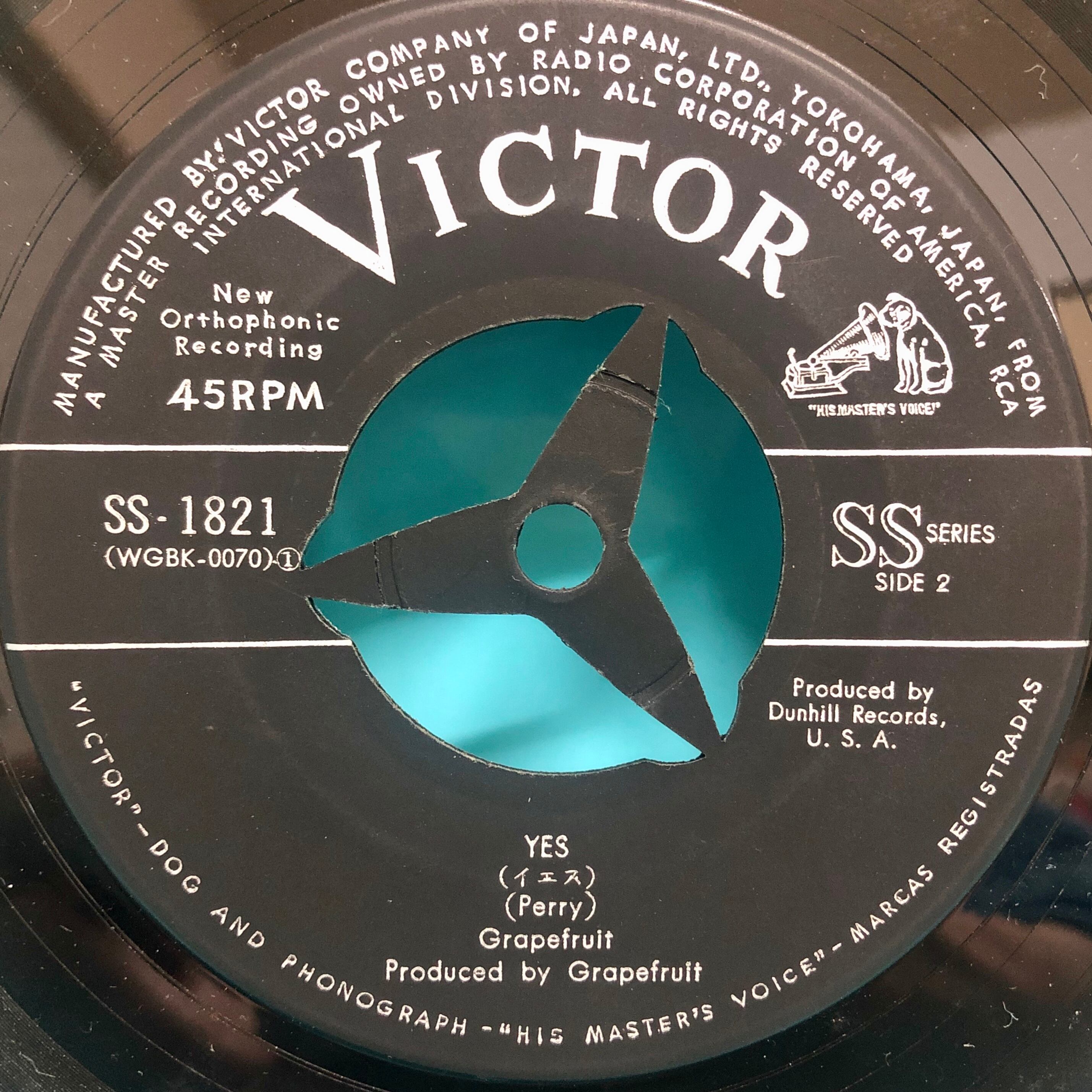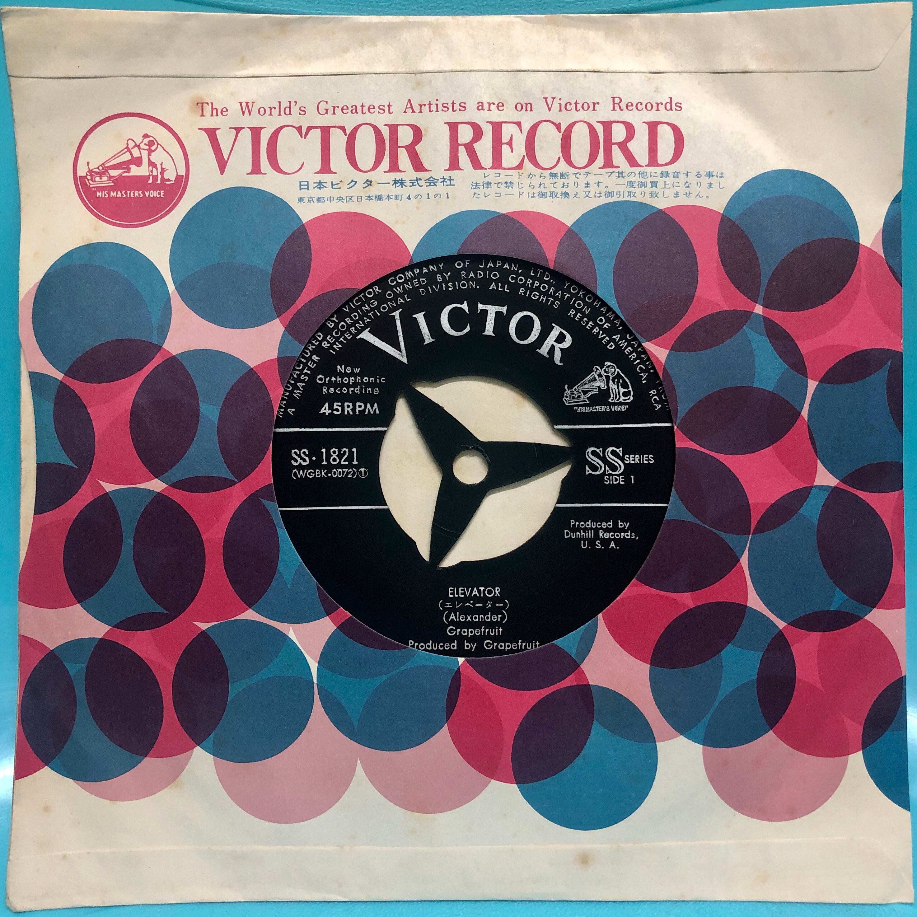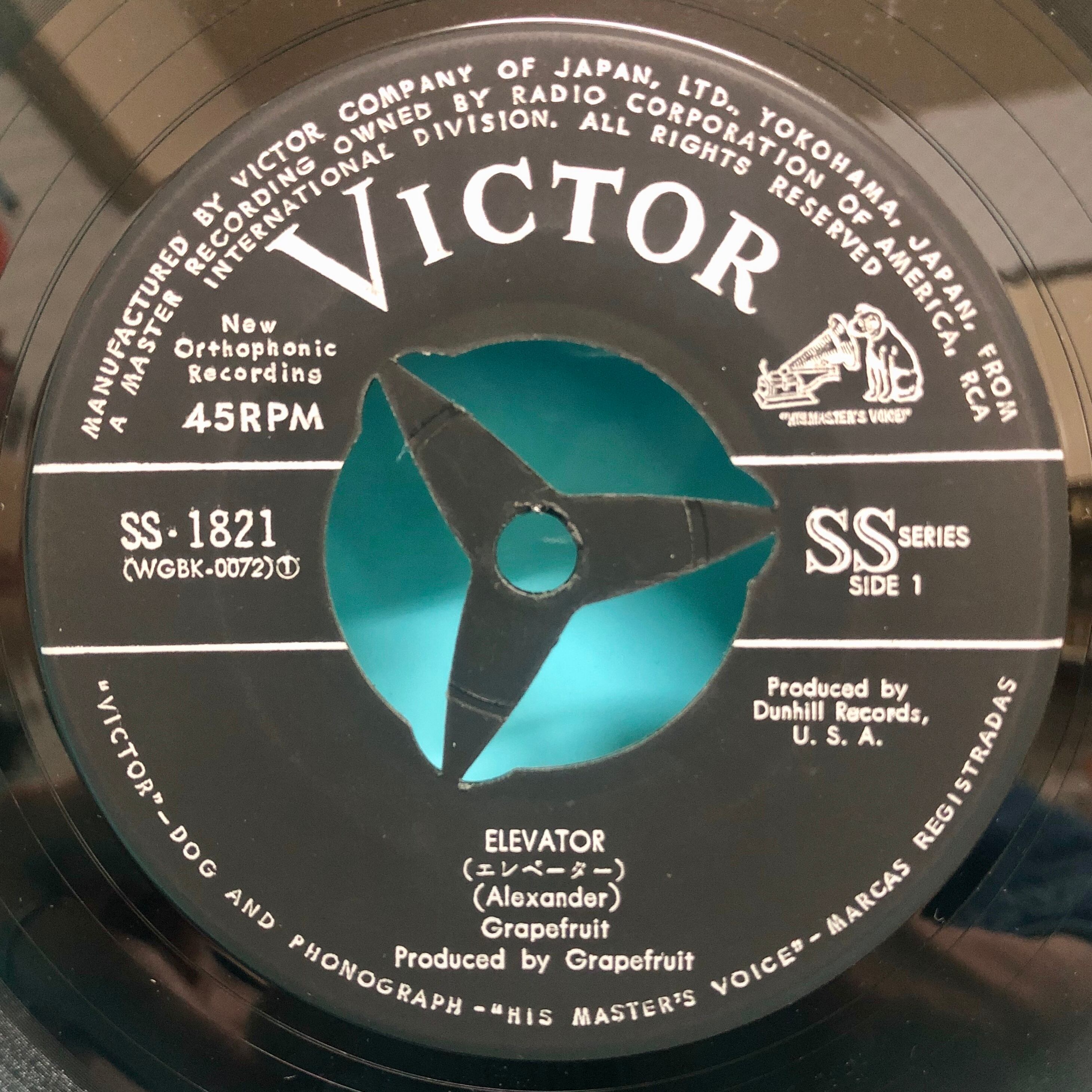 The Beatles の Apple Records より輩出された Grapefruit(グレープフルーツ)2ndシングル日本盤。A面「Elevator」は George Alexander(別名アレックス・ヤング。ジョージ、マルコム、アンガスでお馴染みヤング兄弟の長男(!)でオーストラリアに移住せず、独りイギリスに残った) 作、タイトルどおりイントロ数秒で昇天し、最後まで持っていかれるパーフェクト Pre-Powerpop 超名曲。B面「Yes 」は特にバッキングヴォーカルのハーモニーが極上な正にビートルズィーなこれまた名曲。どちらも1stアルバム収録の代表曲だが、シングル・バージョンで聴きたい至宝の一枚。