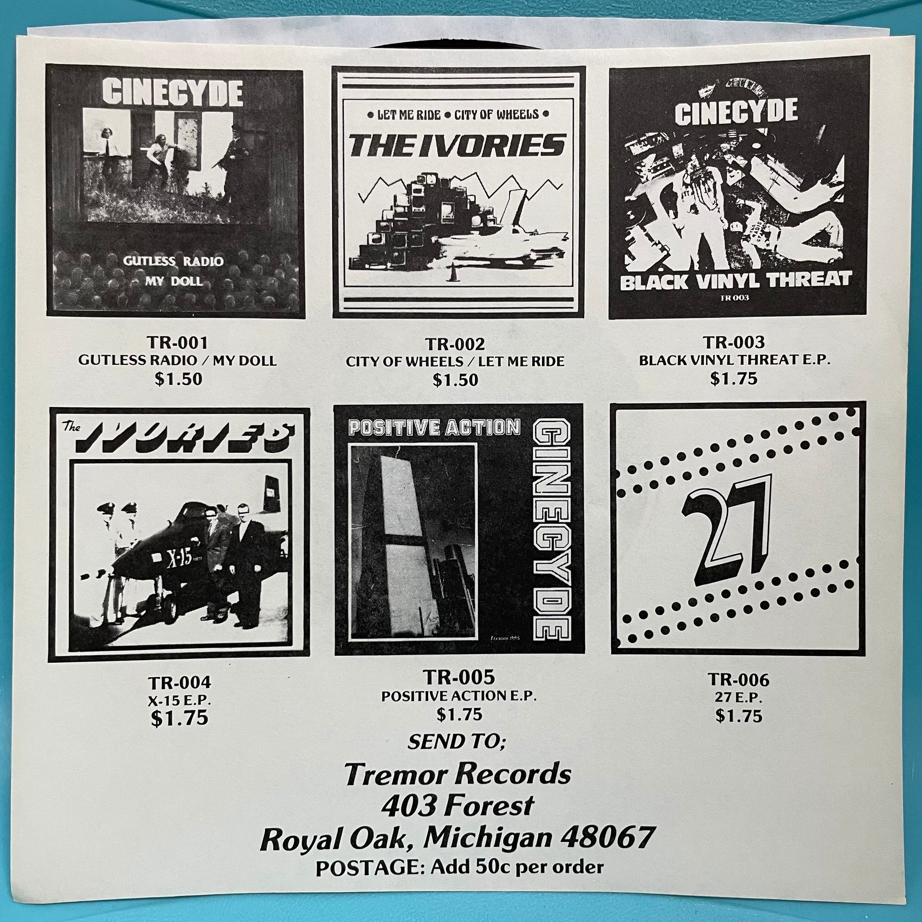 Cinecyde のメンバー Gary Reichel がやっていたデトロイト Punk Rock/New Wave 重要レーベル Tremor Records よりリリースされた The Ivories の3rdシングルEP。全4曲足しても8分足らずであっという間に終わるデトロイトR&Rが詰まった隠れた名盤。特にB-2「So Sorry」は男泣きパンクロックでパワーポップファンにもオススメ。ググると当時あの Flirt や、なんと Gizmos と対バンしていた記録あり〼。嬉しい Tremor Records の広告インサート付属。
