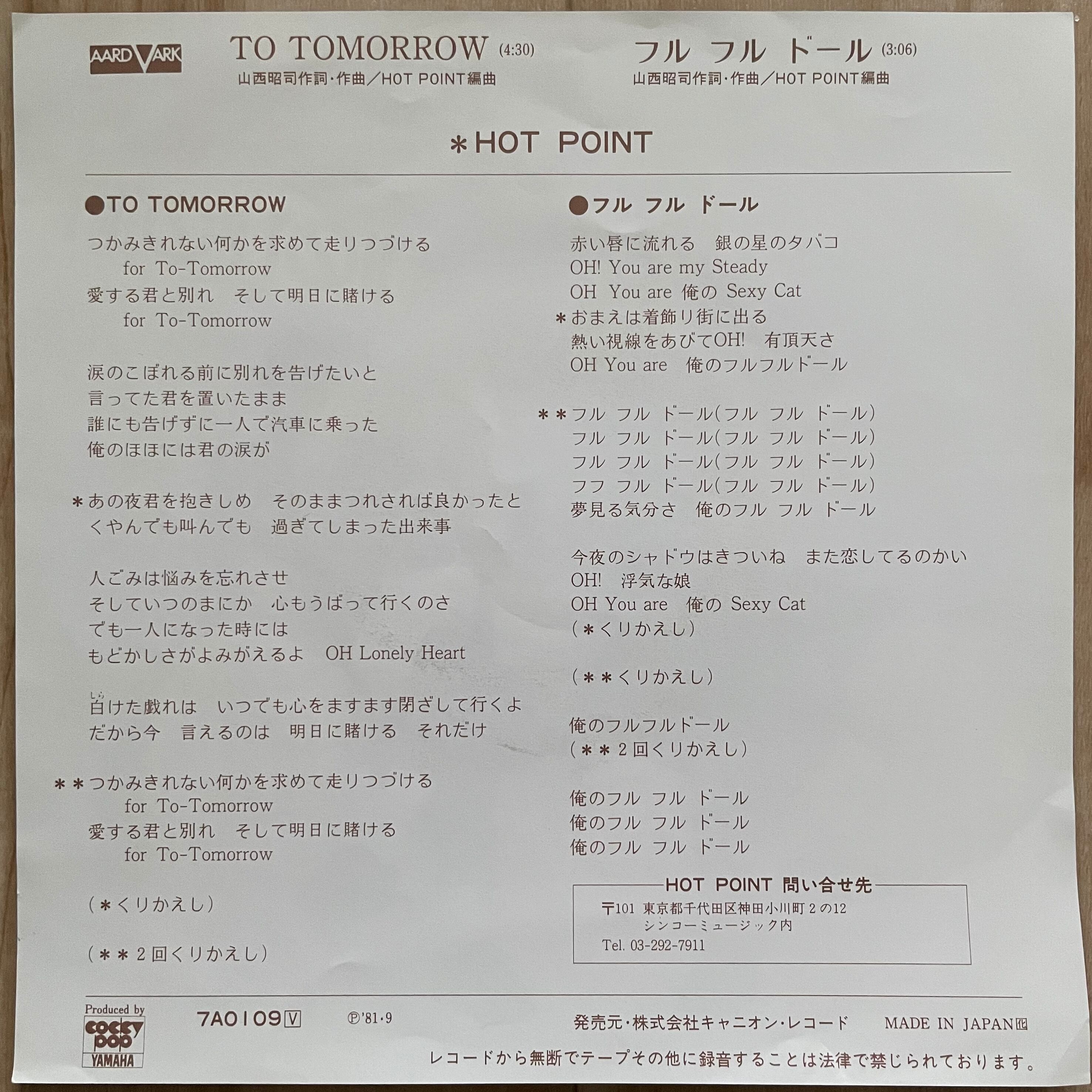 博多産 Neo Mod/Powerpop バンド Hot Point の1stシングル。同郷の The Badge よりレコードリリースは1年早い1981年デビュー。A面 "To Tomorrow" はこれぞ日本のパワーポップ!と声を大にして言いたい大大大名曲。フリップ "Fulful Doll" も格好良いR&R。近年でたコンピ Here Comes The Beats 起きなよスージー(CD) に両面収録。