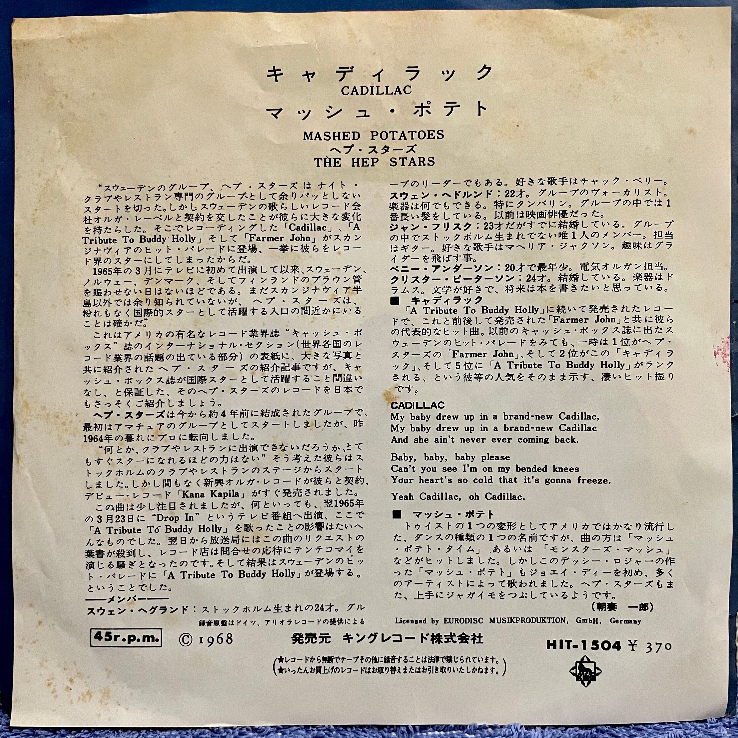 Abba の Benny Andersson (最年少20歳、オルガン担当) 在籍で有名なスウェーデンのビートバンド、The Hep Stars (ヘプ・スターズ) 5thシングル日本盤。A面は1stアルバムの冒頭を飾ったキャディラック、特筆すべきはアルバム未収録のB面マッシュポテト (James Brown作) のキラー高速バージョンが滅茶苦茶かっこいい。