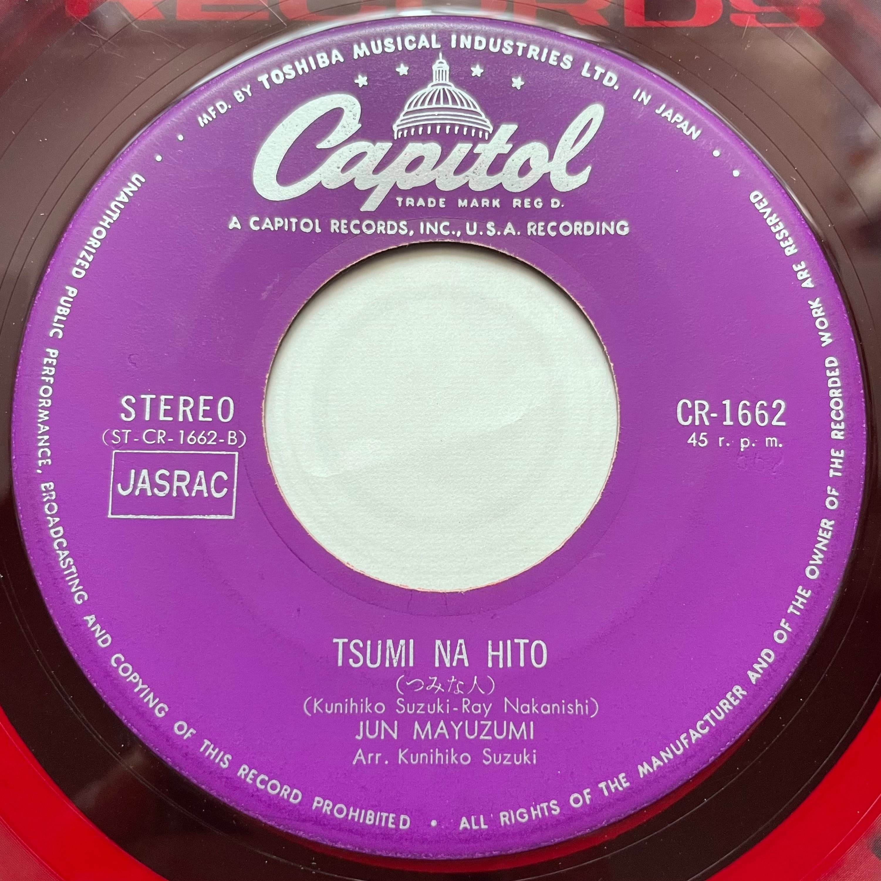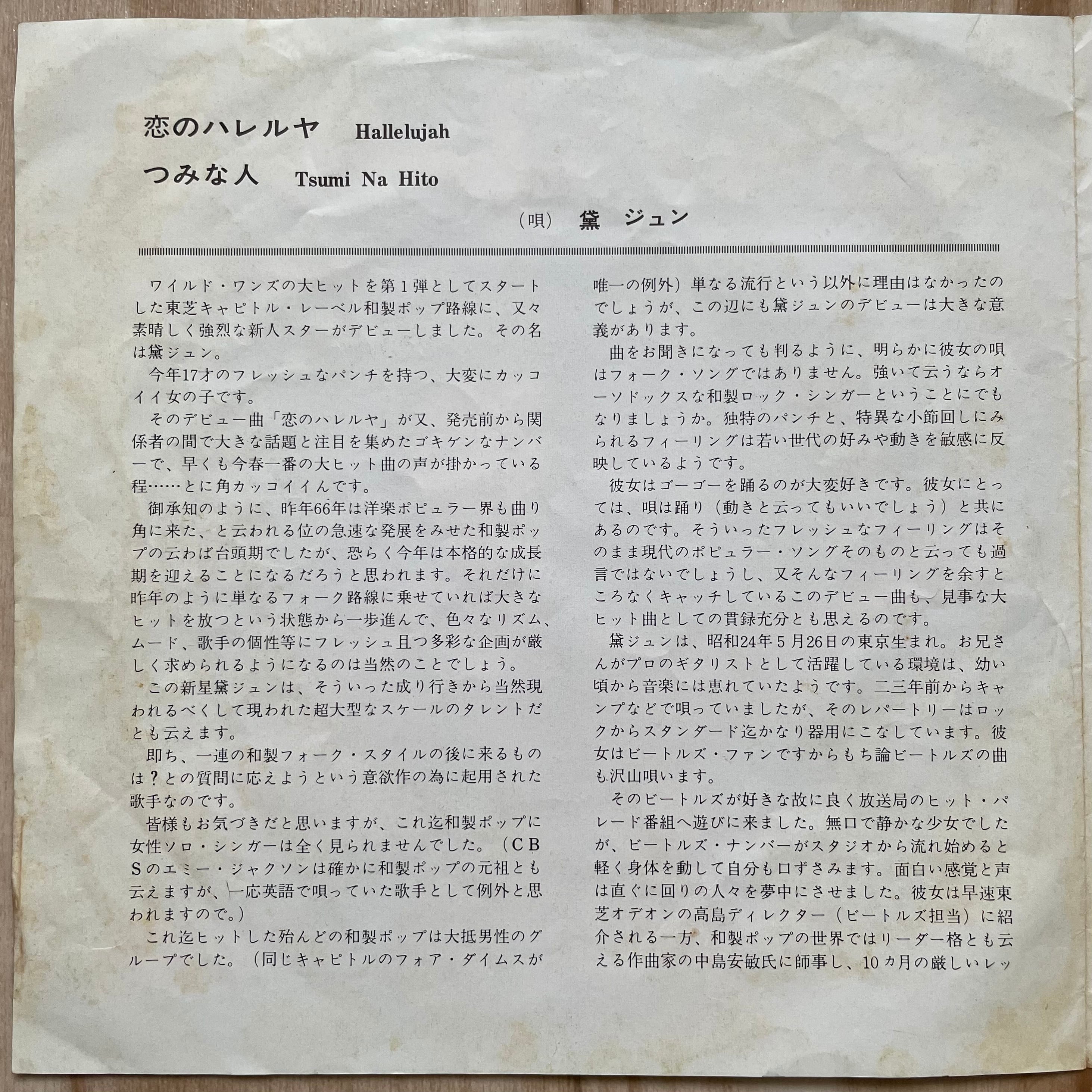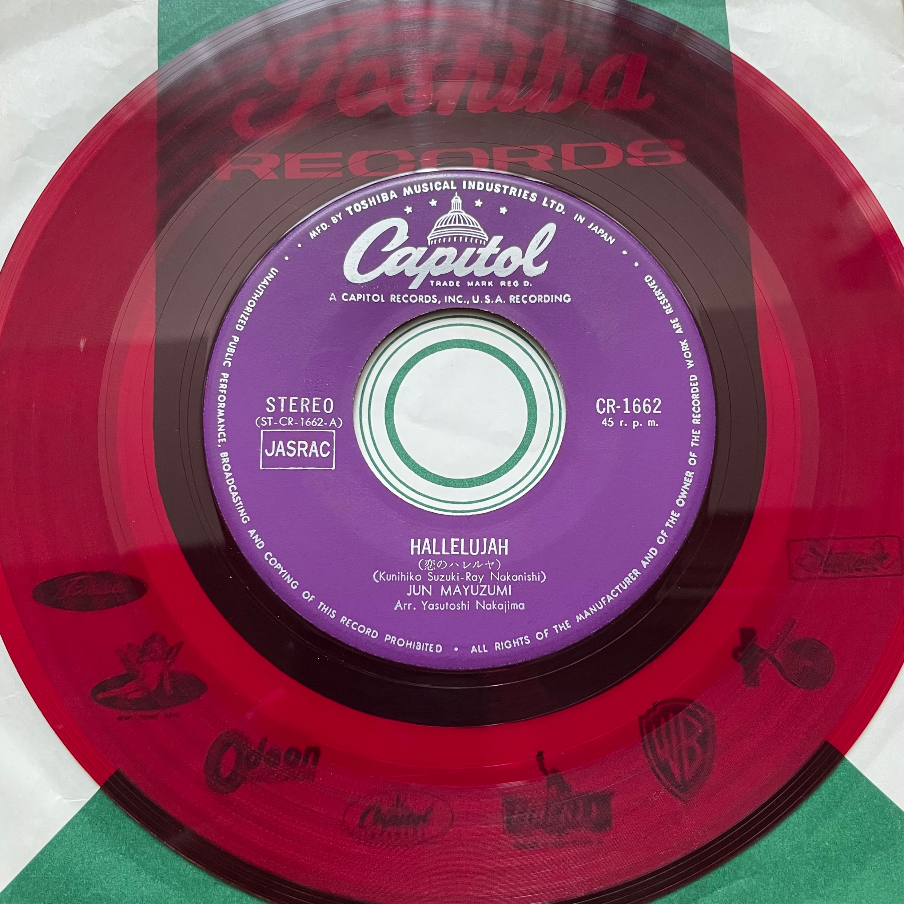 一人GS日本代表、パンチの効いた歌声でおなじみ黛ジュンのデビュー作「恋のハレルヤ」赤盤。両面最高。一家に一枚の名盤。こちらはジャケットが珍しい、表は「まゆずみ」のふりがな無し、(演奏)ブラック・ストーンズの表記なし、裏は黛ジュンの写真ではなく Capitol Records ロゴのみの恐らく初期バージョンになります。