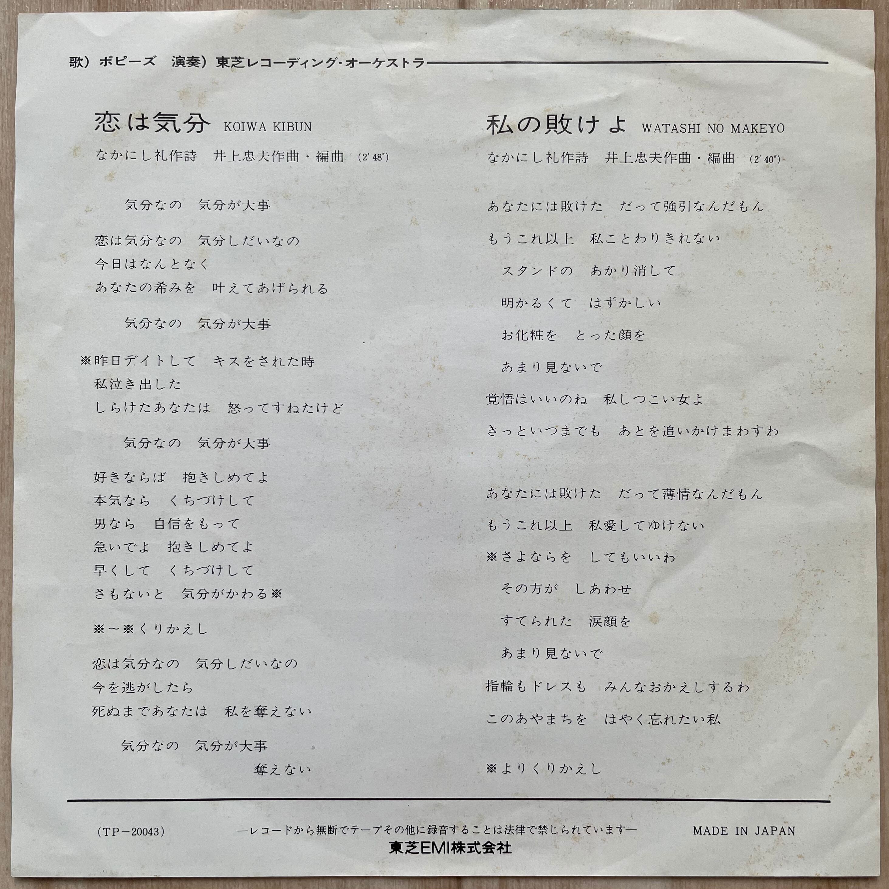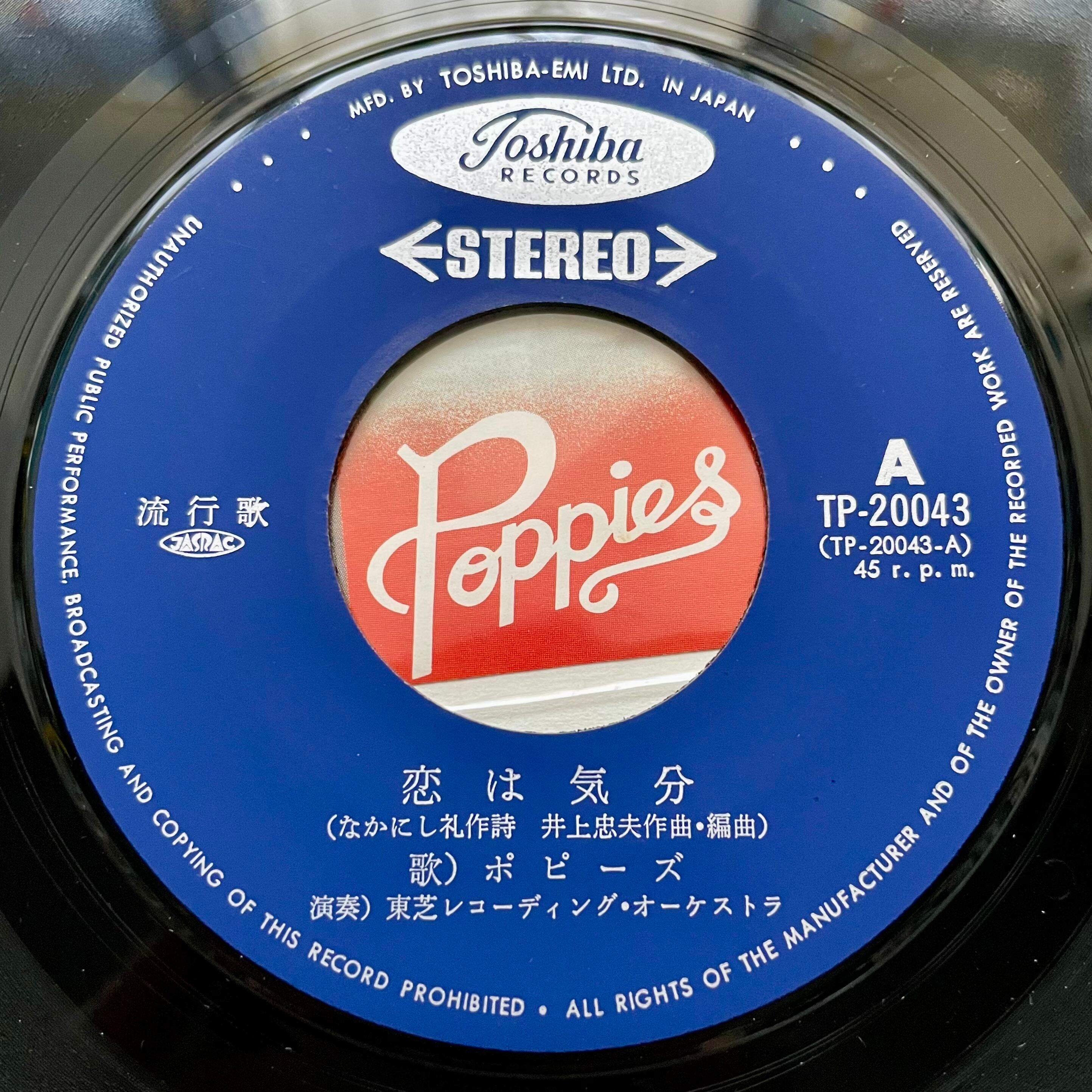 日劇ダンシングチーム選抜 6 人組グループ、その名も「ポピーズ」の大人気 2nd シングル。A面「恋は気分」の冒頭~気分なの 気分が大事~は一度聴いたらしばらく頭から離れなくなる発明。B面「私の敗けよ」も負けず劣らずの傑作。Poppies という名前もロゴも逸品。