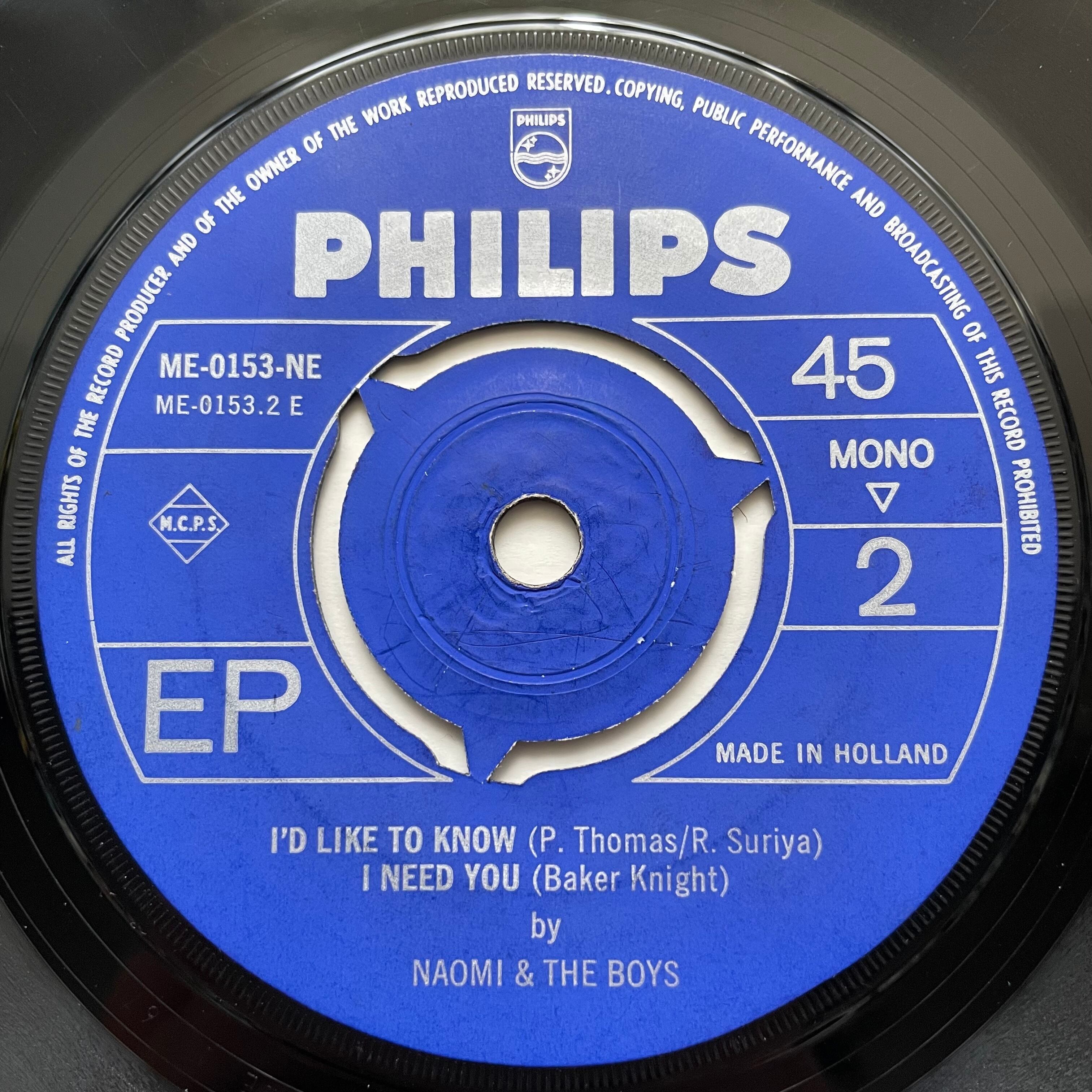 アジア 60s ガールズ一人GSもの、シンガポール代表の Naomi And The Boys 初期EPオリジナル盤。全4曲 Naomi Suriya のヴォーカルが素晴らしい貴重な記録。「As Tears Go By」と「 I'd Like To Know」は Girls In The Garage Volume 9 - Oriental Special に収録、それで知った方も多いはず。レコードはオランダ産でLPみたいな珍しいタイプの Gatefold スリーブ(歌詞付)がまた雰囲気バツグンで良い。