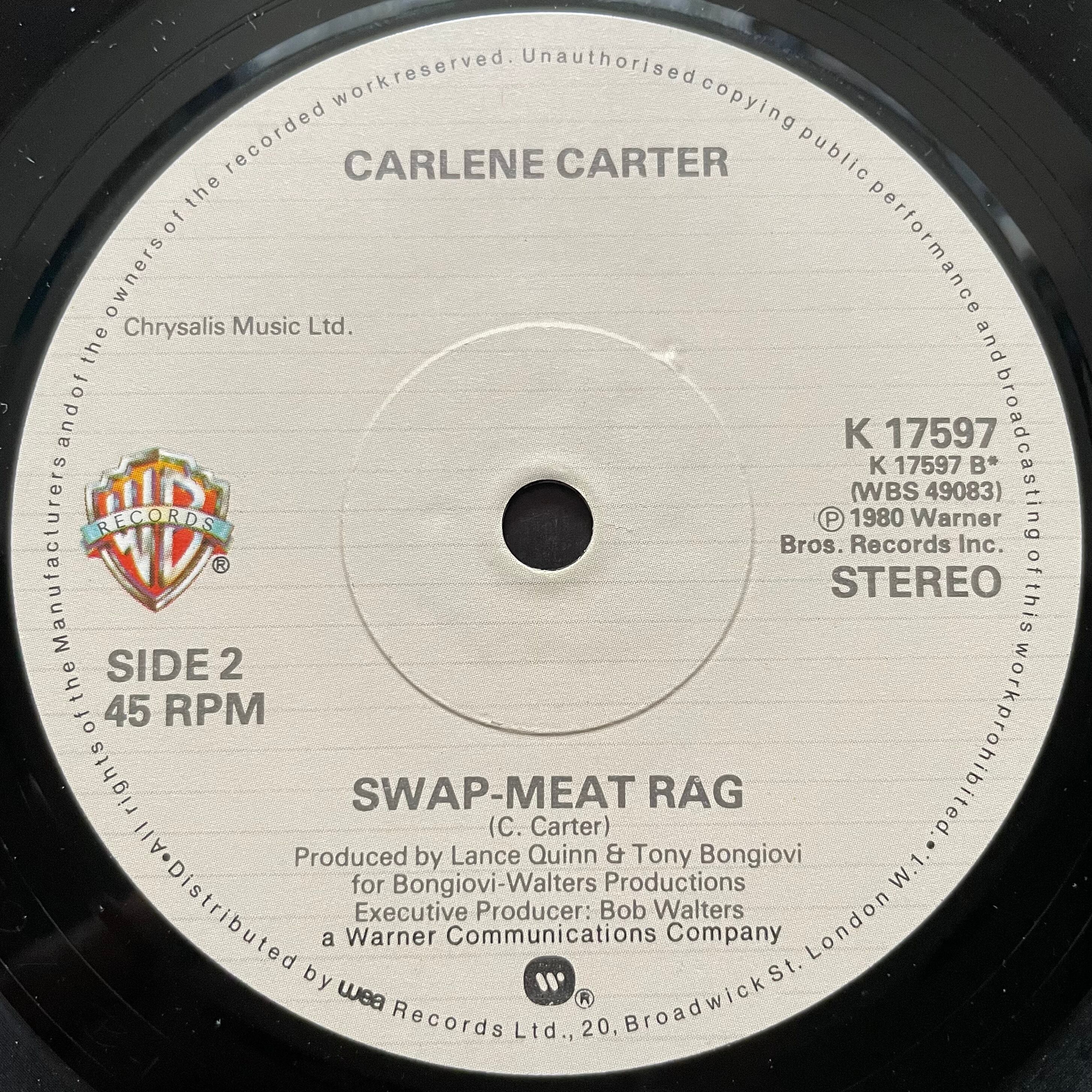 カントリー界のレジェンド Carl Smith と June Carter の娘(離婚後 June Carter は Johnny Cash と結婚するので Johnny Cash の義理の娘でもある)、Carlene Carter の初期シングル。A面「Do It In A Heartbeat」は Nick Lowe と結婚した頃に共作されたであろう名曲。 B面「Swap-Meat Rag」は本人作でこちらも聴き応え十分。