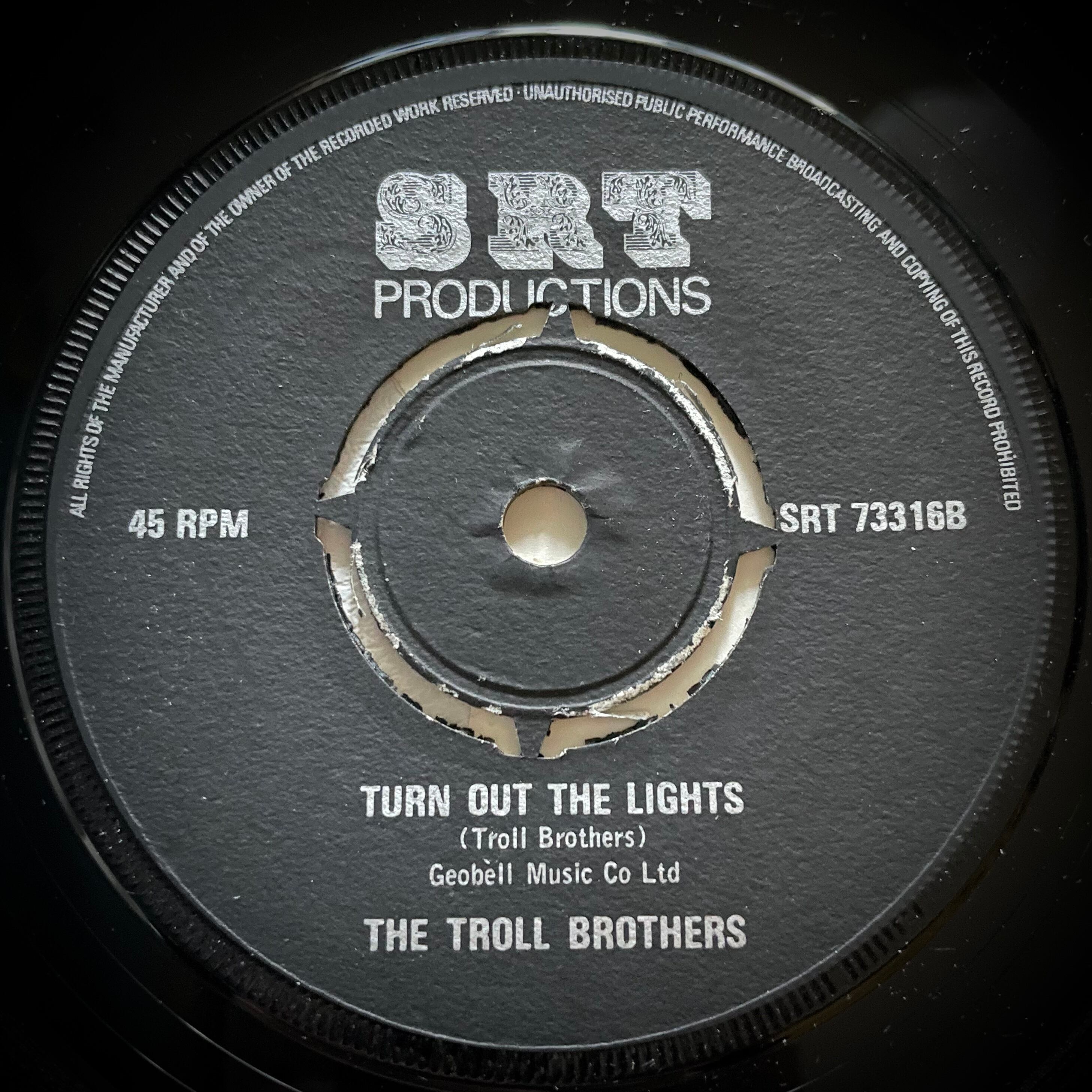 英国 Private Press で有名な SRT Productions Ltd. より1973年にリリースされた The Troll Brothers の唯一シングル盤。コアな Glam ファンに人気のA 面「You Turn Me On」は 近年 Ace よりリリースされた Bob Stanley & Pete Wiggs - Three Day Week (When The Lights Went Out 1972-1975) 収録。嬉しいバンドのプロモ用?写真付属。
