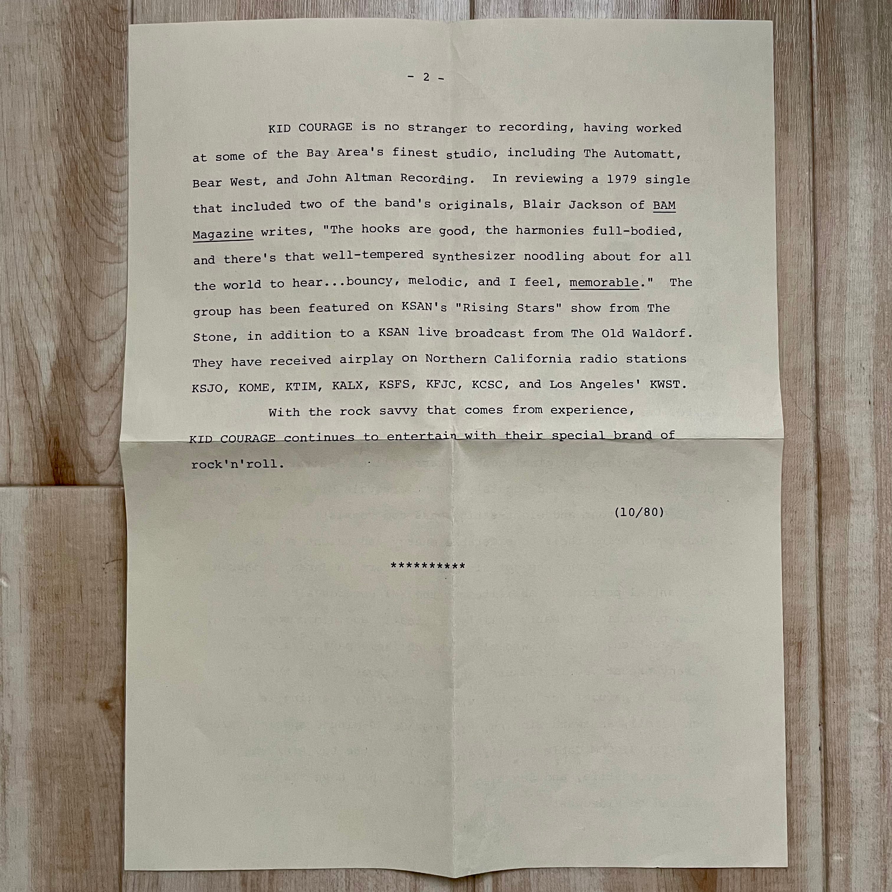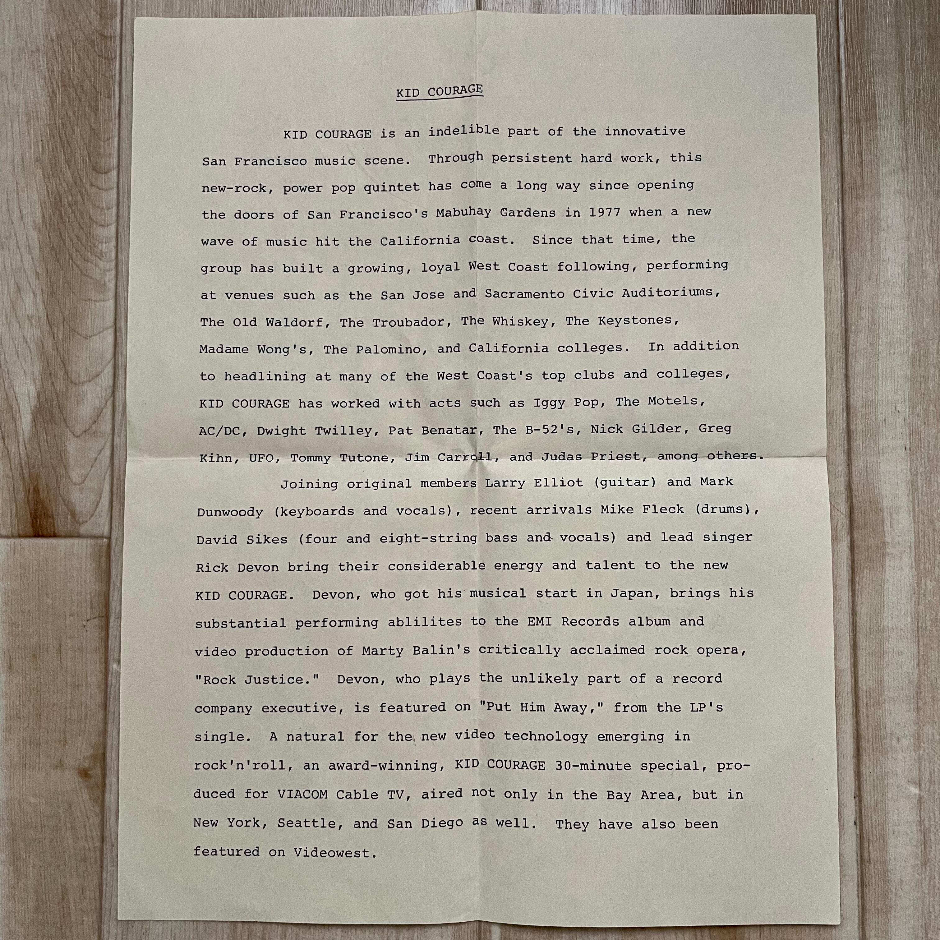 初期メンバーに Mr. Big の Eric Martin が在籍した、地元サンフランシスコでは熱狂的なファンも多いパワーポップバンド『Kid Courage』2nd & Last シングル。リリースは A. P. E. Records とあるがこれ以外のリリースはみたことがない為、恐らく自主のプライベート希少盤、レア度は 1st シングルとは雲泥の差。謎にソソられる脚長メンバーのデザインはインパクト特大でジャケ買い必須。針を落とすとA面は 1st シングル路線のいい感じの曲、特記すべきはB面「I'm A Fanatic」のガッツあふれる男気パワーポップ!これには一発ノックダウンされること間違いなし。当時 "power pop quintet" と称され、Iggy Pop, AC/DC, Dwight Twilley 等との共演、一部で知られるロック・オペラ Various - Rock Justice に Ric Devon 名義で収録されていること等、貴重な記録が満載のプロモシート付属。