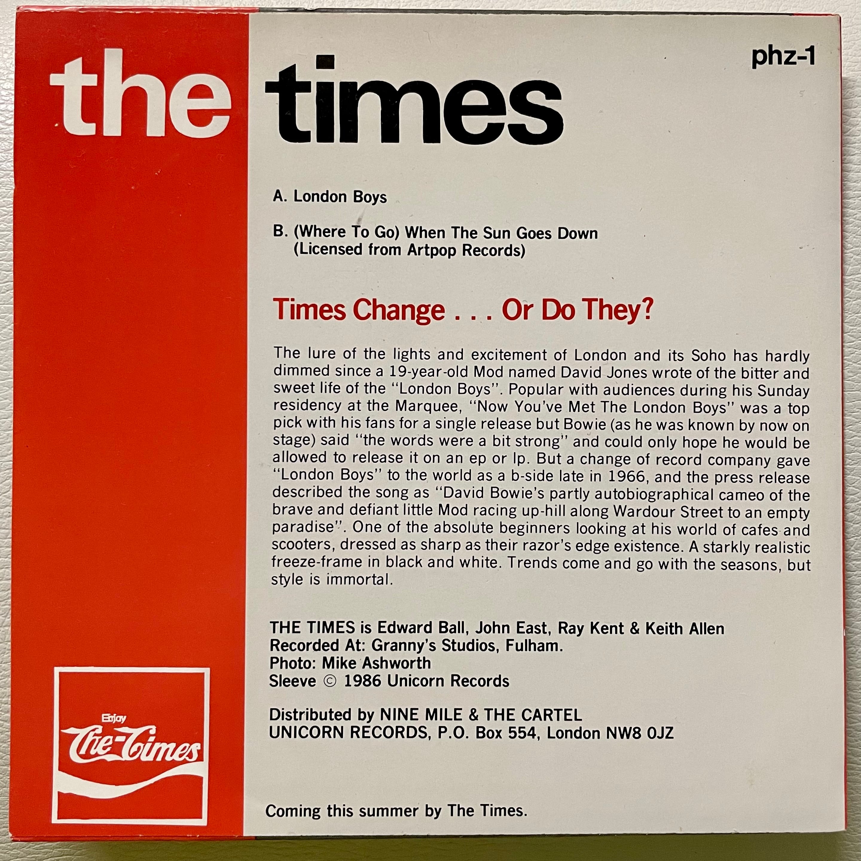 ネオモッズ愛好家には説明不要、英国ポップ職人、天才 Edward Ball 率いる The Times の Unicorn Records リリースのシングル。タイトル曲 London Boys は モッズ期 David Bowie のカバー、B面 (Where To Go) When The Sun Goes Down はオリジナル、両面ともに流石の仕上がり。
