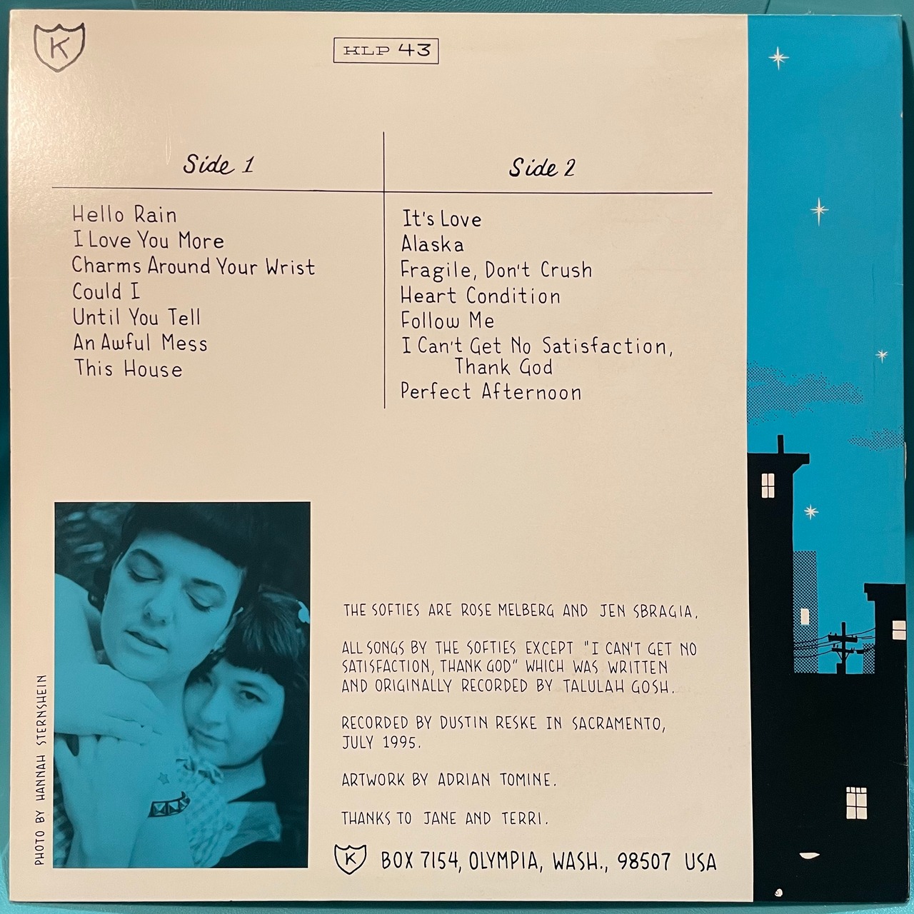 ワシントン州オリンピアのインディー・レコード老舗レーベル「K」(K Records)より1995年にリリースされた『The Softies - It's Love』1st アルバム。Rose Melberg (Tiger Trap,Go Sailor) と Jen Sbragia (All Girl Summer Fun Band) のフォーキー・ポップ・デュオによる Talulah Gosh のカバー含む全14曲、ジャケットも内容もオシャレな90sを象徴するクラシック名盤。いつの間にか海外、国内ともに$100以上する人気盤と化しており下手なレア盤より入手困難。