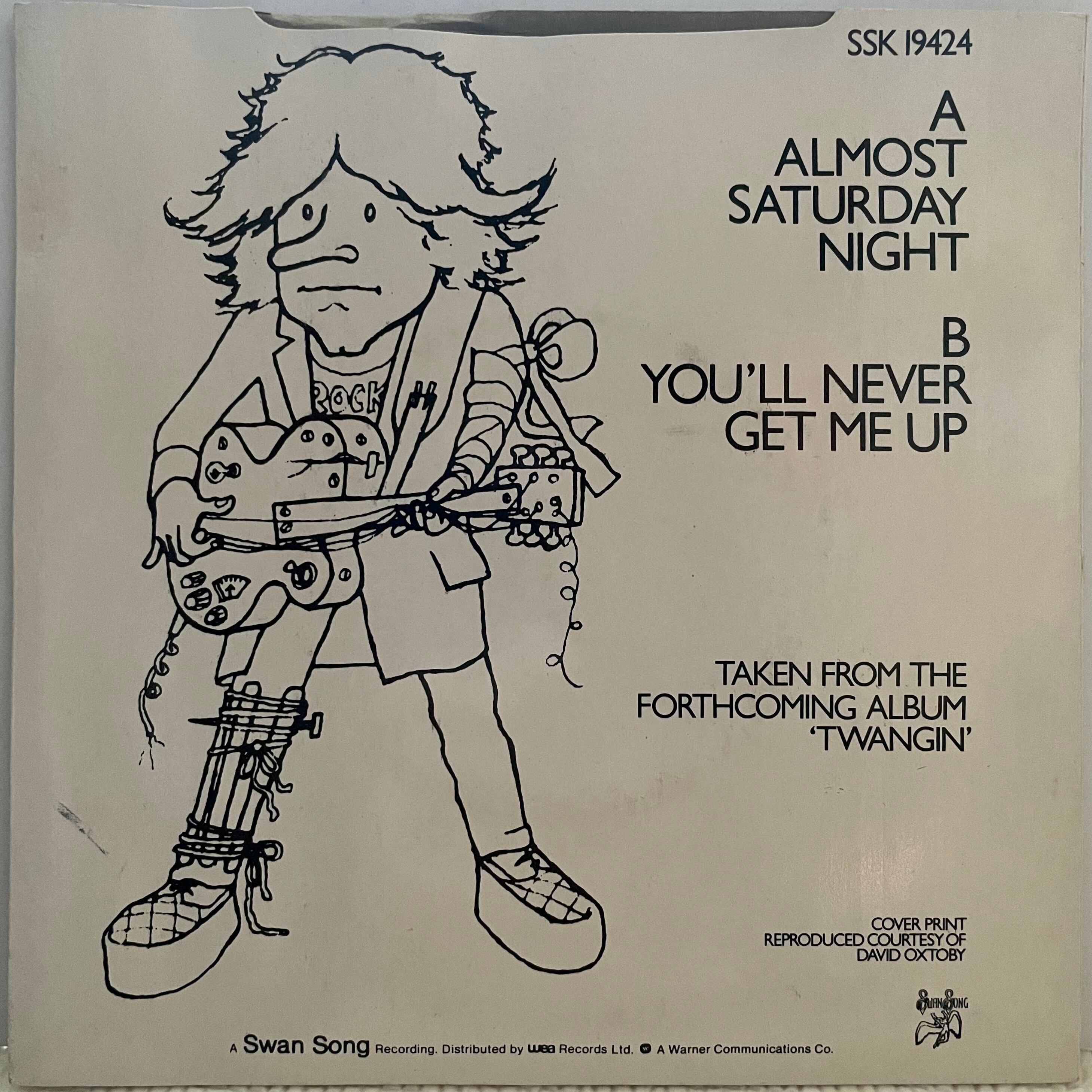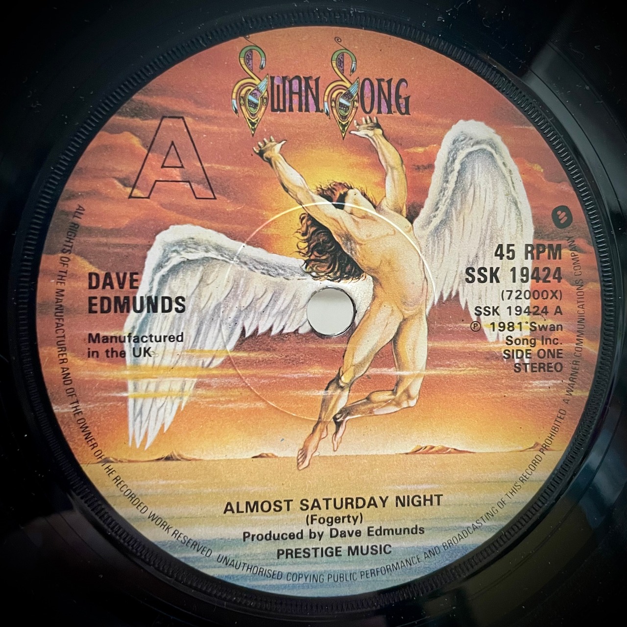 Dave Edmunds 「Almost Saturday Night」シングル。かわいいジャケットデザインに油断して針を落とすと、説得力の塊みたいな John Fogerty のご機嫌なカバーが飛び出す、いつ聴いても痺れる名盤。Atlantic 傘下の Swan Song レーベル+信頼の"Porky"カットで音も最高です。