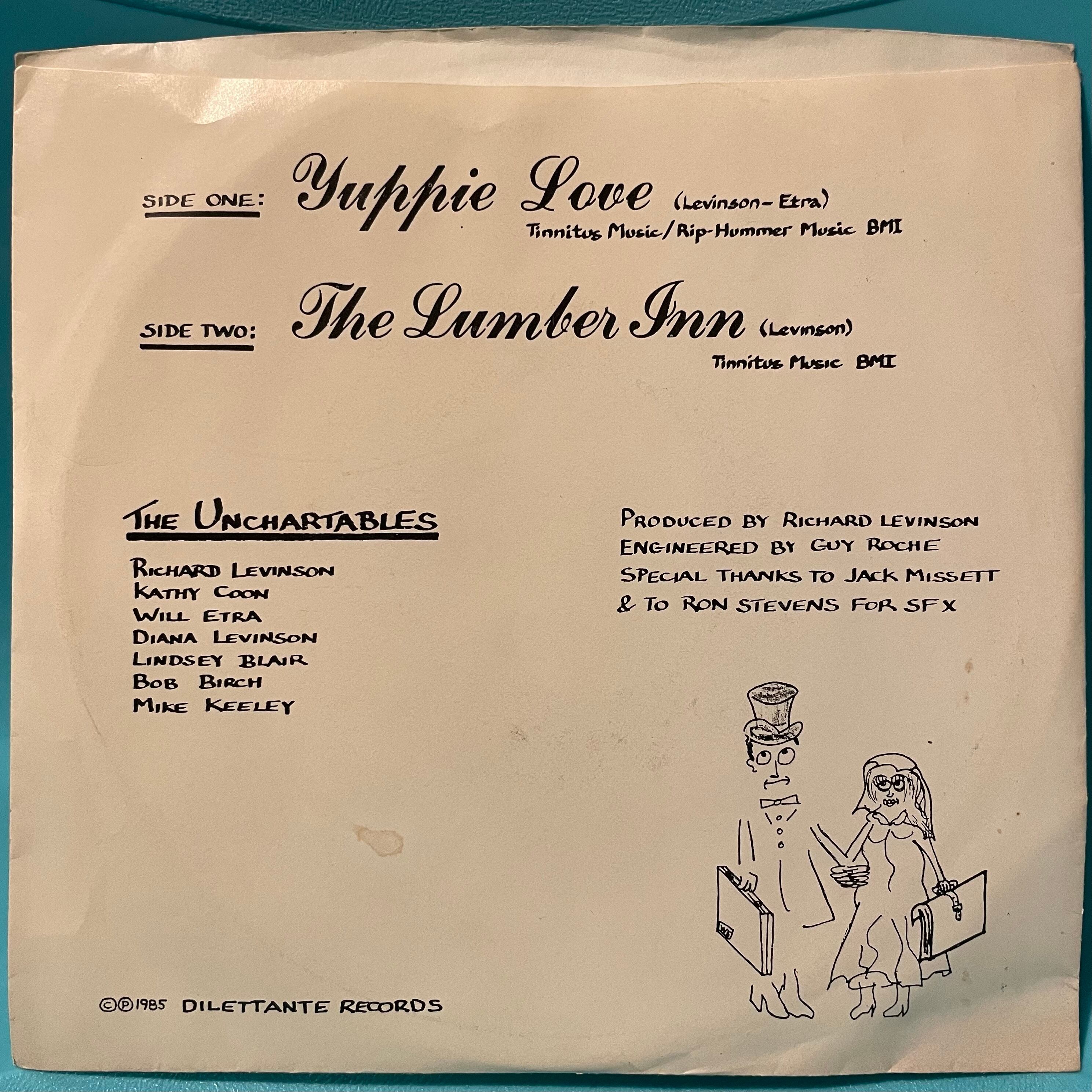 多分アメリカのバンドということ以外、詳細不明な謎のレコード The Unchartables の唯一シングル。一度みたら忘れられないイラストが目を引くチープなジャケットから飛び出す、A面「Yuppie Love」が良い意味で期待を見事に裏切る、単純明快なポップソングで、悔しいが時々無性に聴きたくなるフィメイル・ヴォーカルの隠れた名曲。