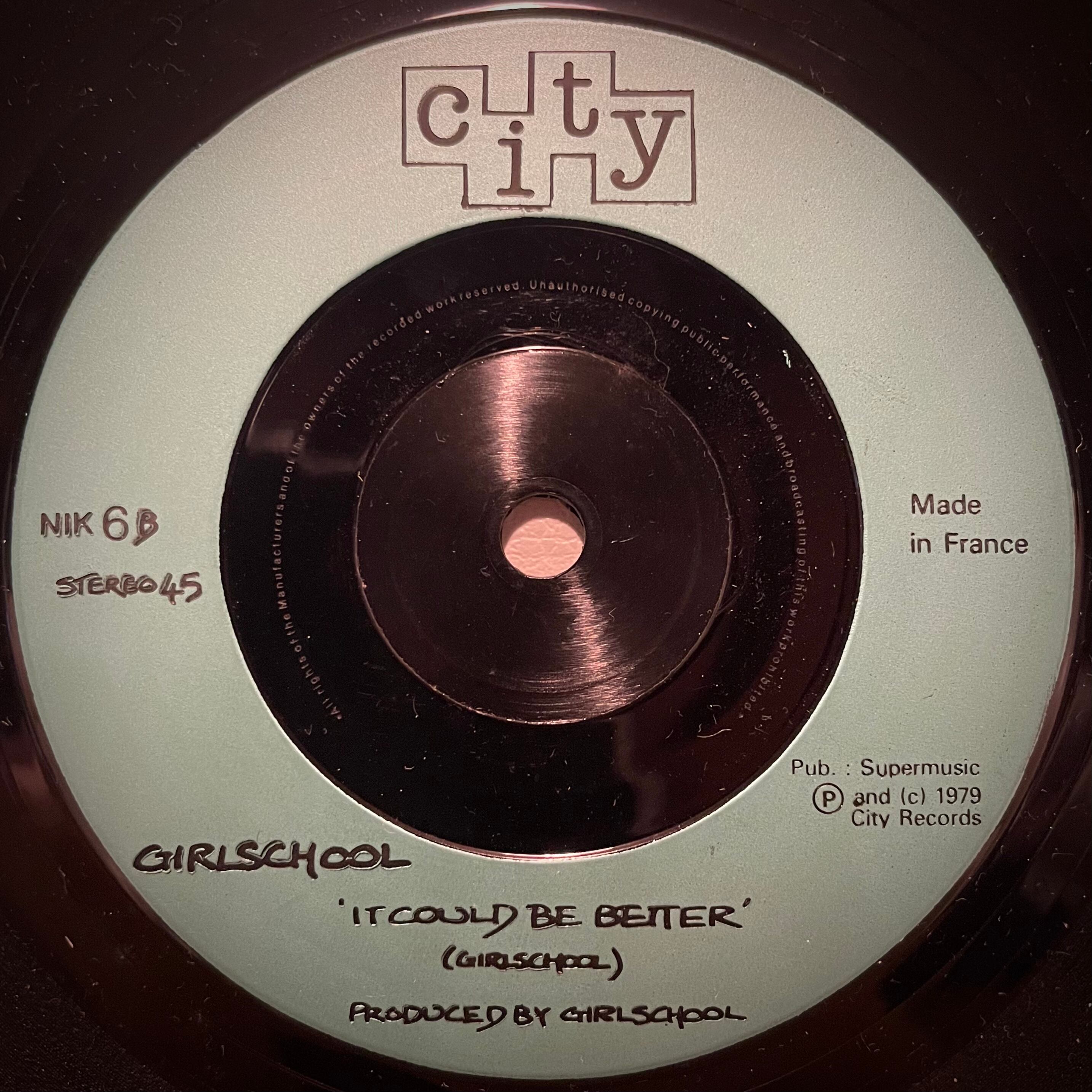 英国ハードロック、ヘヴィメタル、ガールズバンドとして有名な Girlschool 1st シングルのメイド・イン・フランスのオレンジ・スリーブUK盤。ジャンル関係なく最高にロックで格好良い人気のシングル。聴いたことない方は視聴だけでも是非。